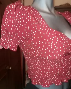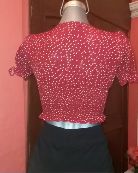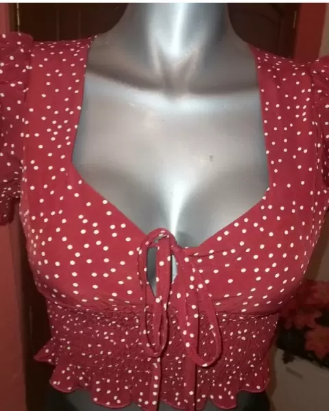 Lindo top, con ribete fruncido, de lunares, cordón delantero.