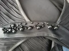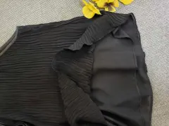 Top con perlas. Blusa negra de gasa plizada, con cuello tipo corbatín de satín negro y perlas negras bordadas. Ideal para la temporada.