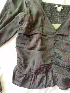 Top corazones. Top corazones, cuello V, mangas holgadas, color negro estampado corazones, talla s.