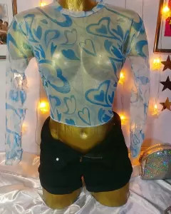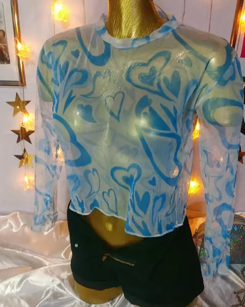 Top corazones Malla. 💛PRENDA NUEVA💛🌼Playera corazones azul, manga larga, crop.🌼Tela de malla, se amolda al cuerpo y tiende a estirarse💛💛MEDIDAS💛💛🌼Hombro a hombro 41 cm 🌼Axila a axila 47 cm🌼Largo 43cm 🌼Largo manga 52 cm 🌼Checa las medidas por favor.🌼La prenda queda a tallas XCH, CH, y M