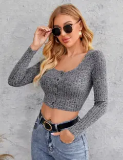 Top corto con botón delantero. Top corto, color gris, de buena calidad, el cuello es redondo, tiene botones delanteros, las medidas se encuentran en la foto.