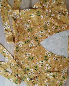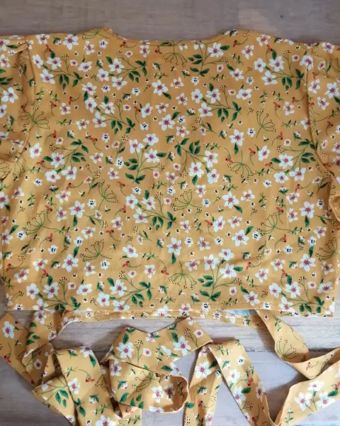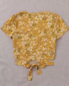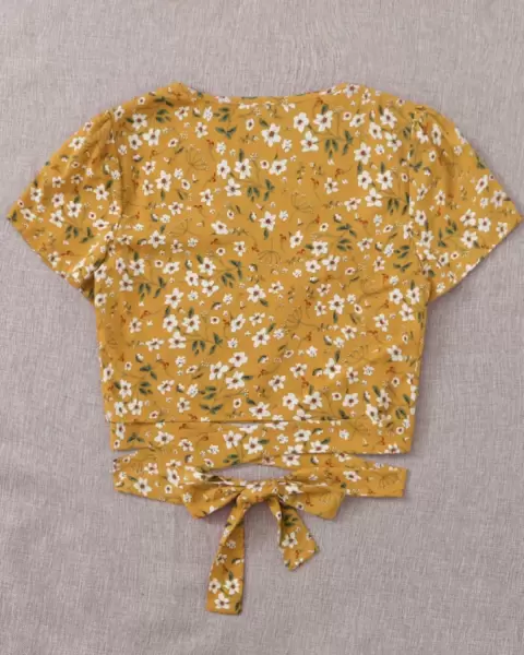 Producto nuevo. Top amarillo corto de tela ligera con cordón cruzado floral de margaritas.Medidas: ancho 41 cm x altura 39 cm, ancho hombros 40 cm, largo manga 19 cm, pecho 48 cmMaterial: 35% Poliéster 65% algodón