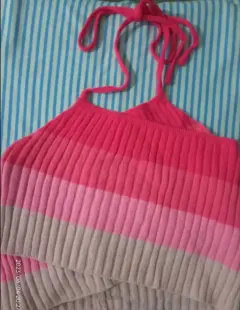 Top crop de cuello halter, tela estira bastante, cruzado en tonalidades rosas.