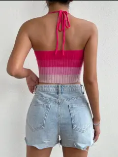 Top crop halter. Top crop de cuello halter, tela estira bastante, cruzado en tonalidades rosas.
