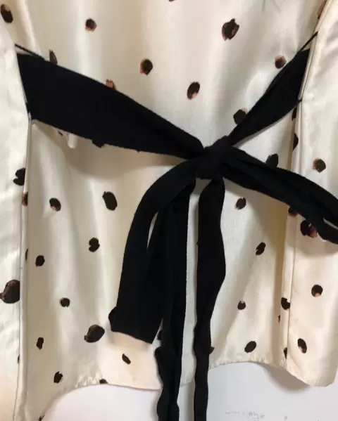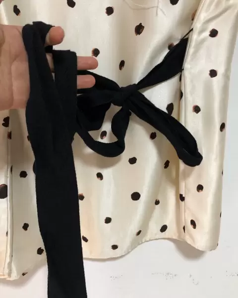 Top de lunares con cinturon de tela. Top de lunares Cinturon de tela Marca MangoColor crudo con lunares negrosTalla M100% viscosaCinturón 100% algodón Colección Committed, cuello redondo, manga cortaTiene un detalle en el cierre de lagrima, el cordon se rompió se muestra en fotos