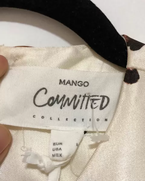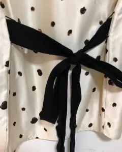 Top de lunares Cinturon de tela Marca MangoColor crudo con lunares negrosTalla M100% viscosaCinturón 100% algodón Colección Committed, cuello redondo, manga cortaTiene un detalle en el cierre de lagrima, el cordon se rompió se muestra en fotos