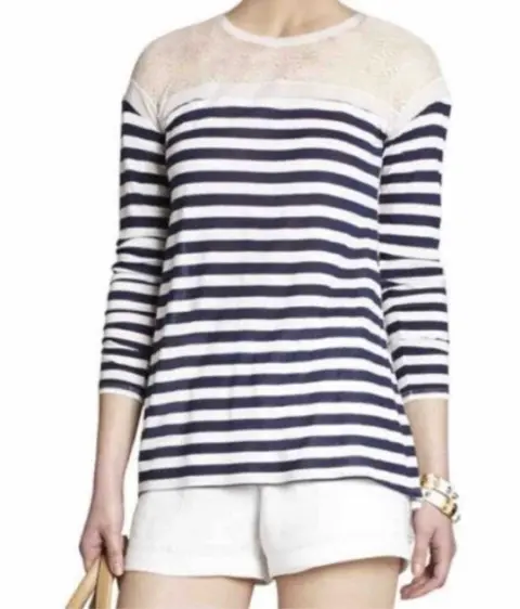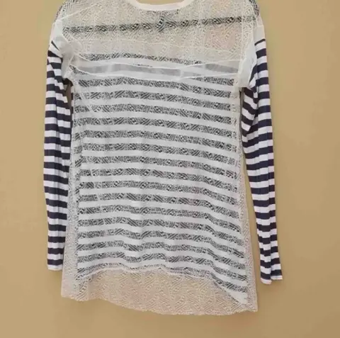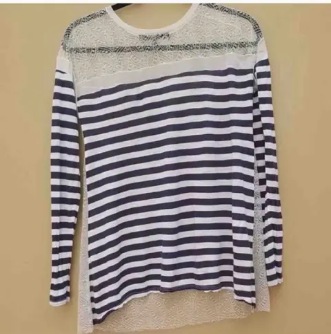 Top de rayas náuticas BCBG sz sRayas náuticasEs chicaManga largaCuello redondoEncaje transparente en la espaldaDobladillo altoJersey: rayón, lyosellEncaje: nailonPre-loved