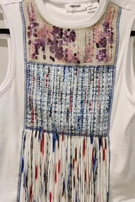 Top Desigual. Hermoso top de cuello redondo, compuesto de lentejuelas, flecos y bordado. La prenda está impecable