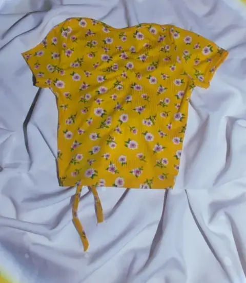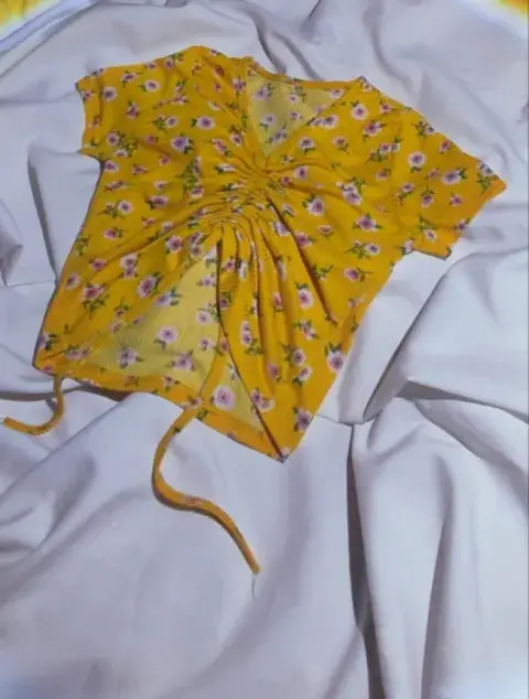 Top floral amarillo. Top Floral Amarillo, 💛🧷Corto, Fruncido Delantero con Cordon,🧷Manga Corta, Ajustado, Tipo Canalé,🧷Cuello en V,🏷️Talla XS / S
