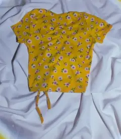 Top Floral Amarillo, 💛🧷Corto, Fruncido Delantero con Cordon,🧷Manga Corta, Ajustado, Tipo Canalé,🧷Cuello en V,🏷️Talla XS / S