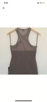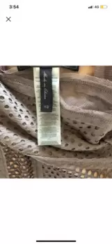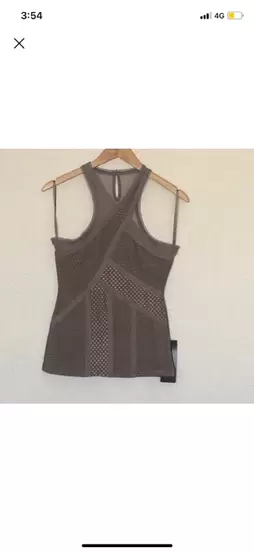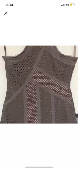 Es un top con tela transparente y tiene un forro color carne, es pegado al cuerpo y tiene spandex para marcar la figura, el color es entre café y verde olivo