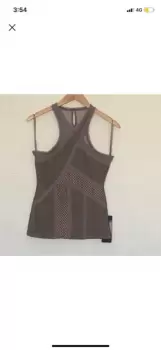 Top geométrico transparente. Es un top con tela transparente y tiene un forro color carne, es pegado al cuerpo y tiene spandex para marcar la figura, el color es entre café y verde olivo