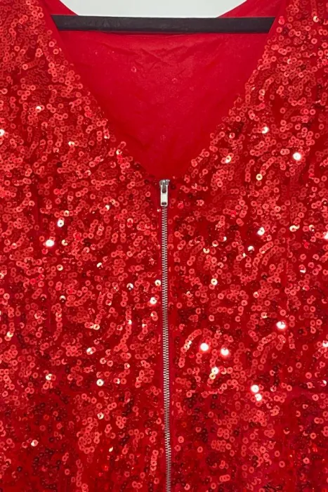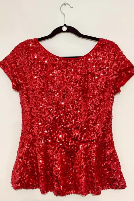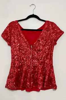 Blusa de lentejuelas rojaTipo peplum, acintura tu cuerpoCon cierre traseroIdeal para este 14 de febrero