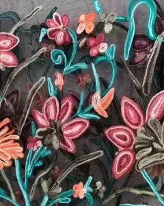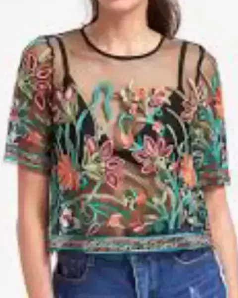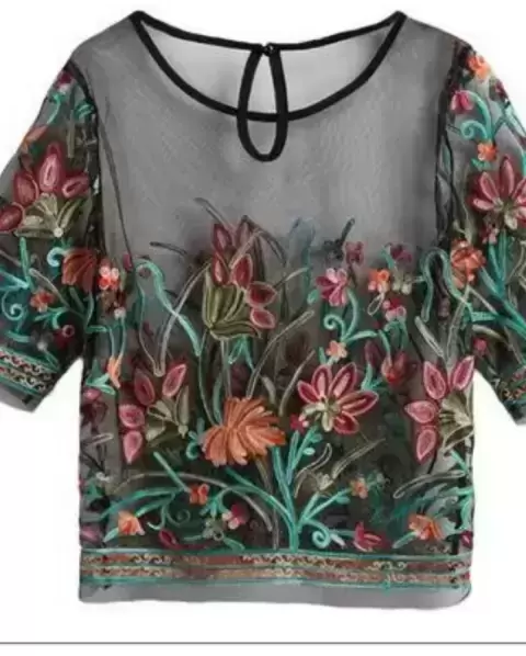 Top negro transparente malla , manga corta con bordado en distintos colores, muy bonita a la cintura, fresca…se puede combinar desde pantalon formal, falda o shorts, te encantará