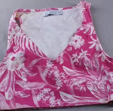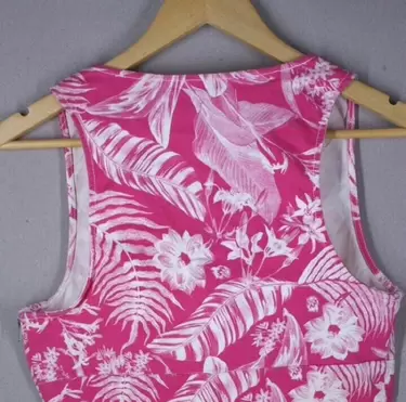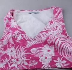 Top Rosa con blanco sin mangas, tiene cierre de un lado, cuello en V. Talla M también esta publicada en XS. Tiene estampado de flores y plantas en color blanco sobre fondo rosa mexicano, excelente para la temporada.