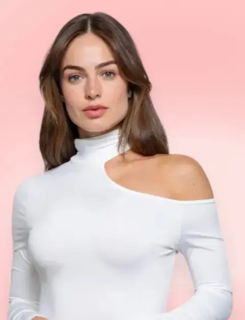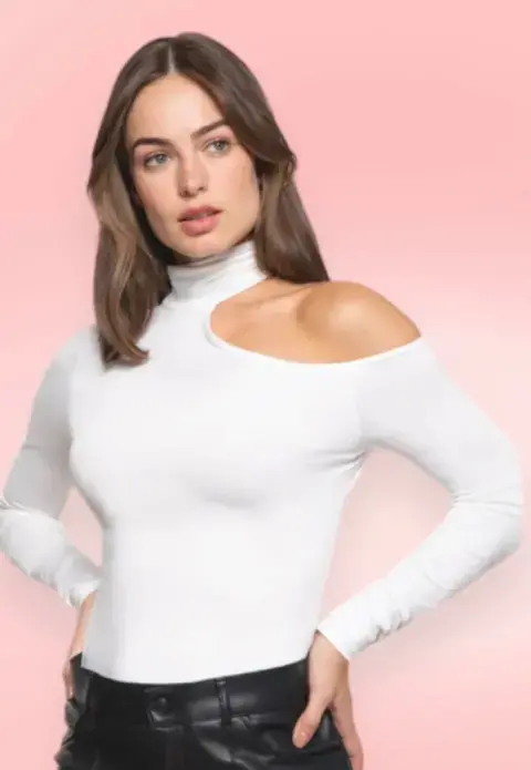 TOP SILK CHEMISETTE. Es una linda blusa o top hecho de microfibra que permite que sea muy flexible y cómoda. Cuello alto y manga larga. Tiene un escote en hombro que la hace una blusa asimétrica pero muy femenina.Marca Chemisette.