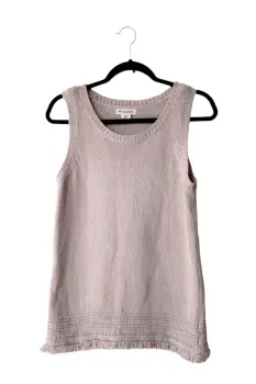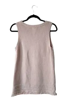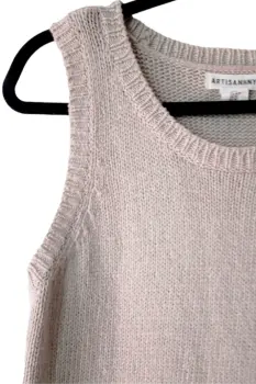 Top tejido color beige, escote redondo, sin mangas de la marca Artisan NY talla M. El producto es usado en excelentes condiciones sin detalles. Proviene de un hogar libre de humo de tabaco y mascotas.Medidassisa: 50 cmscadera: 48 cmslargo: 69 cms60% algodón, 40% acrílco