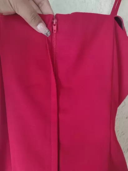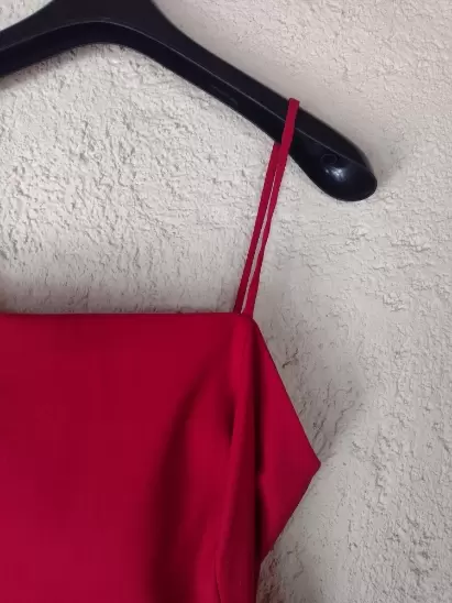 Top con cierre en la parte tracera, tiene costuras que marca la silueta, es un rojo brillante, tela tipo de vestir, no transparenta. Queda bien a una talla L.