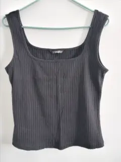 Lindo diseño de top de tirantes en color negro, de canalé, entalla muy bonito al cuerpo y estira. Medidas: largo 51.5 cm Pecho 87 cm, composición 93% algodón 7% Elastano.Se ve igual que la foto. Super bonita y 100% recomendable.