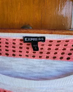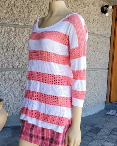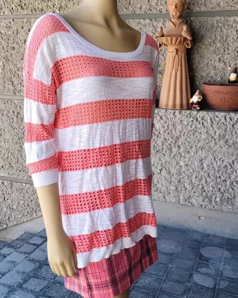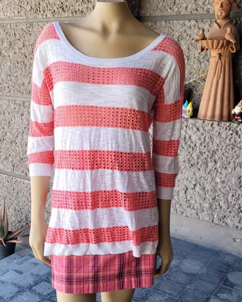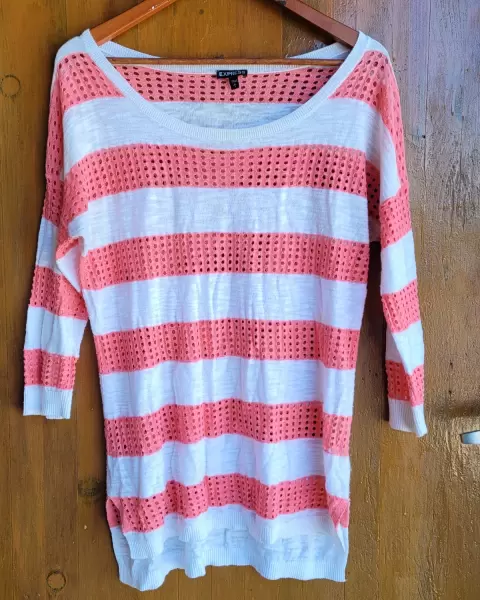 Túnica Express de 3/4 mangas. Túnica de manga 3/4 Express, talla mediana, mezcla de colores rosa y blanco, escote redondo, impresión de rayas, aspecto angustiado, mangas 3/4, hecha de algodón y mezcla de rayón, previamente utilizado en buenas condiciones.