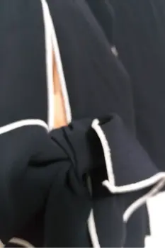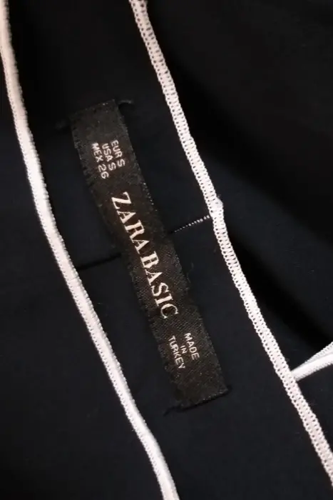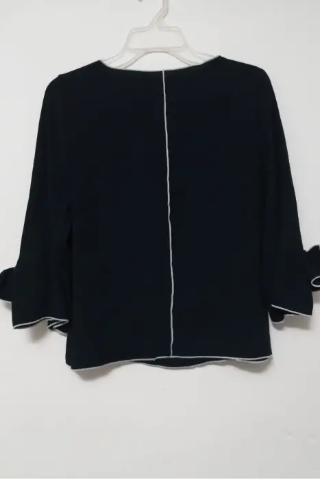 Blusa negra con orillas blancas, manga 3/4 con abertura y moños, ZARA, talla S. esta un poco jalada de las costuras debajo de una manga, No rota.Medidas:De axila a axila 45cmDe largo 57cm