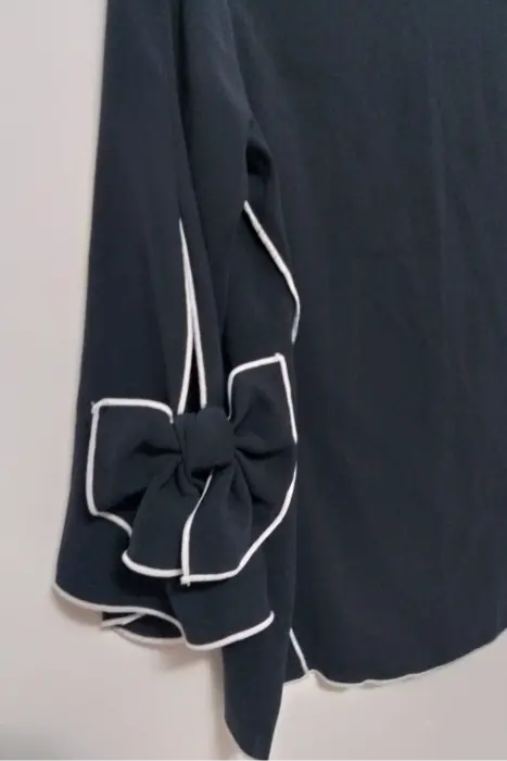ZARA BLUSA NEGRA CON MOÑOS EN MANGAS. Blusa negra con orillas blancas, manga 3/4 con abertura y moños, ZARA, talla S. esta un poco jalada de las costuras debajo de una manga, No rota.Medidas:De axila a axila 45cmDe largo 57cm