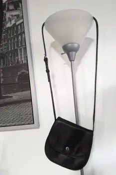 Bandolera vintage negra. Hermosa bandolera de piel vintage con una solapa redondeada que cierra con un broche de presión metálico en el centro. La costura es uniforme y precisa, lo que sugiere una alta calidad de artesanía. Medidas 20 x 20 CM. Última imagen referencia de uso.