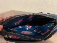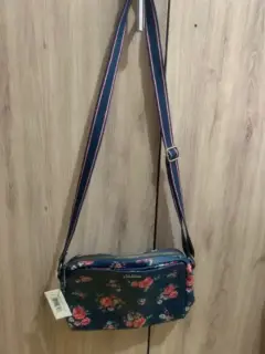 Bolsa pequeña (23 cmx20 cm) pero espaciosa, color azul con estampado floreado y correa ajustable. Tiene dos compartimentos uno con cierre y otro con broche magnético. Nueva con etiqueta