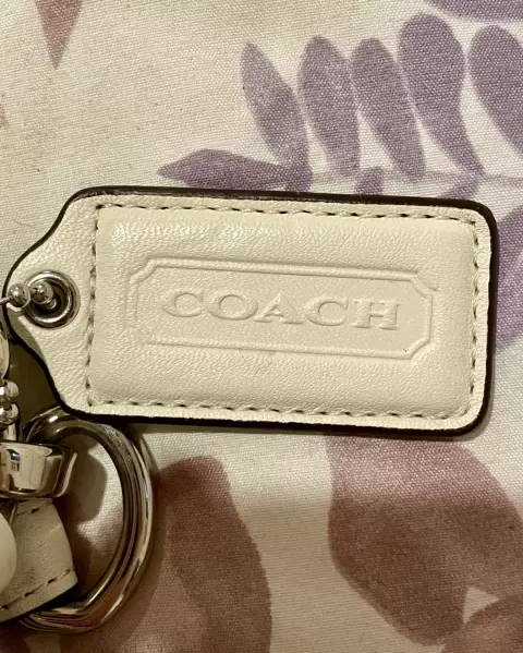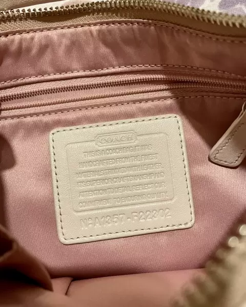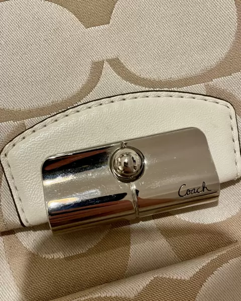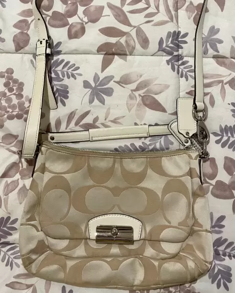 Bolsa Coach original de segunda mano. De tela beige satinada estampada con el logo de la marca. Interior en perfectas condiciones forrado de tela satinada rosa con bolsillo con cierre y dos compartimentos. Exterior con mínimo manchado. Detalles de piel color crema: dos correas (larga tipo crossbody removible y corta tipo satchel), accesorio etiqueta Coach, etiqueta Coach en interior, cursores y broche. 20 cm de largo, 29 cm de ancho, 26 cm de correa corta y 90 cm de correa larga. Hermoso diseño, gran calidad, espaciosa por dentro y versátil por su color y material.