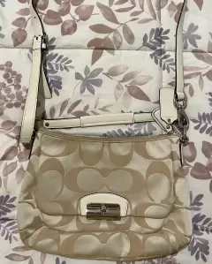 Bolsa Coach Original Crossbody / Satchel Beige. Bolsa Coach original de segunda mano. De tela beige satinada estampada con el logo de la marca. Interior en perfectas condiciones forrado de tela satinada rosa con bolsillo con cierre y dos compartimentos. Exterior con mínimo manchado. Detalles de piel color crema: dos correas (larga tipo crossbody removible y corta tipo satchel), accesorio etiqueta Coach, etiqueta Coach en interior, cursores y broche. 20 cm de largo, 29 cm de ancho, 26 cm de correa corta y 90 cm de correa larga. Hermoso diseño, gran calidad, espaciosa por dentro y versátil por su color y material.