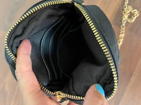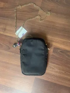 Bonita Crossbody bandolera , color negra el asa es de cadena , tiene dos compartimentos adelante y por dentro tiene forro de lona muy resistente , también tiene compartimentos adentro para tarjetas , celular , monedas. Medidas : 14cm de ancho por 21 de alto