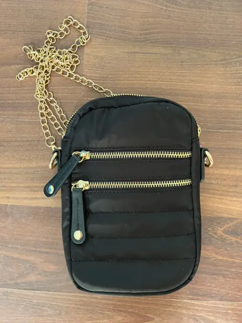 Bolsa Crossbody. Bonita Crossbody bandolera , color negra el asa es de cadena , tiene dos compartimentos adelante y por dentro tiene forro de lona muy resistente , también tiene compartimentos adentro para tarjetas , celular , monedas. Medidas : 14cm de ancho por 21 de alto