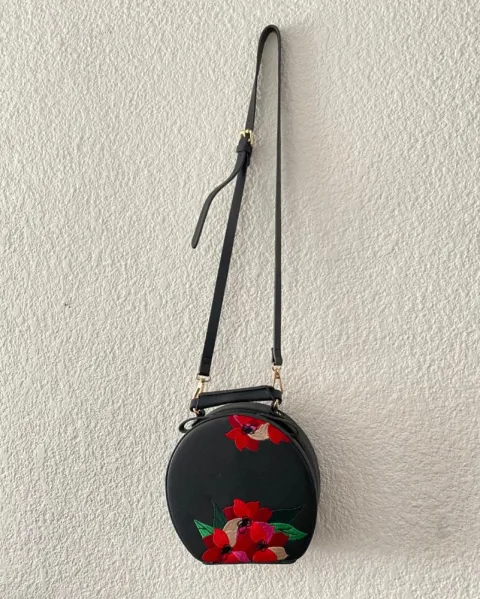 Bolsa de flores. Hermosa, la use pero esta muy bien cuidada, no tiene detalles de uso. Se ve pequeña pero es muy amplia, cabe un celular, cartera, labial, llaves... jeje