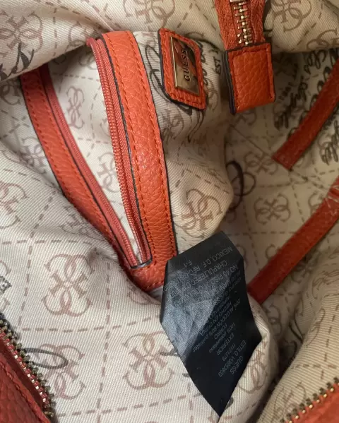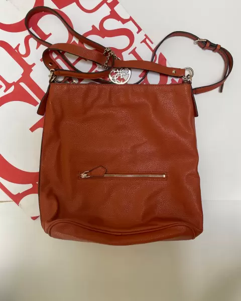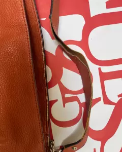 Bolsa Guess naranja. Bolsa en color naranja, la puedes usar en hombro o tiene asa larga para que se lleve crossbody. Es bolsa de uso tiene detalles, se aprecian en la foto 4. La tela no tiene manchas o rota. Tiene bolsa con cierre al costado