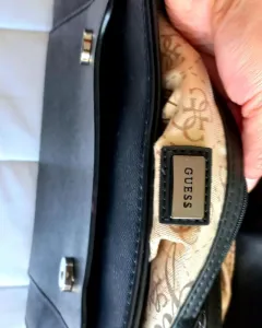 Bolsa Guess negra, en excelente estado.Tiene aplicaciones de gamuza y pedrería en la parte frontal.Entrego en su bolsa cubrepolvo, la correa aun guarda su empaque.