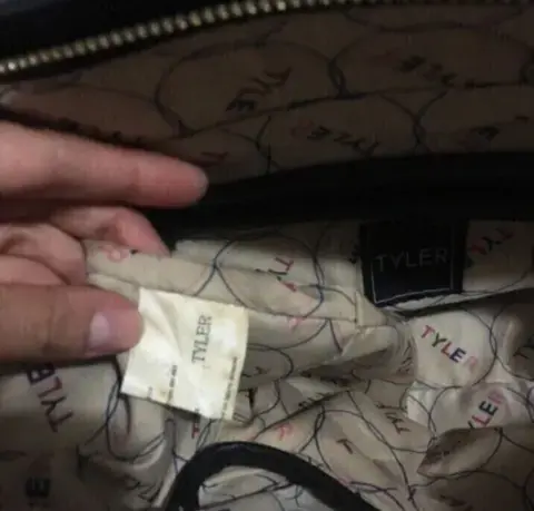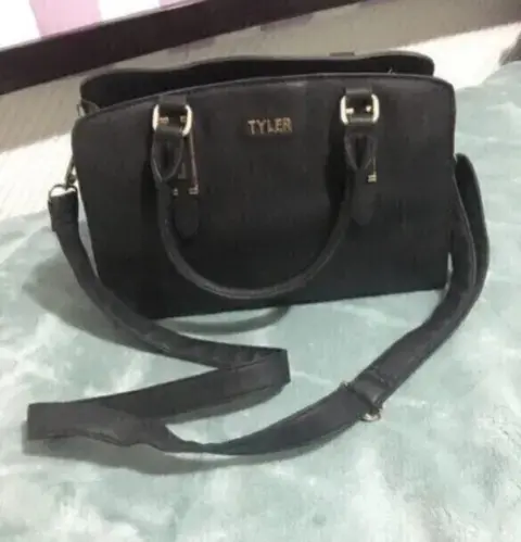 Bonita bolsa negra marca Tyler.😍Los detalles que tiene son súper pequeños, en el sierre de adentro se le cayo el broche del sierre, y tiene una pequeña mancha blanca en la parte de atrás de la bolsa (por fuera) pero nada de esto afecta su uso.