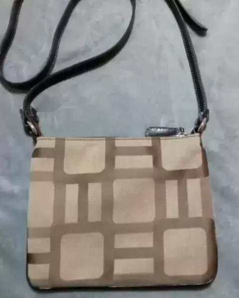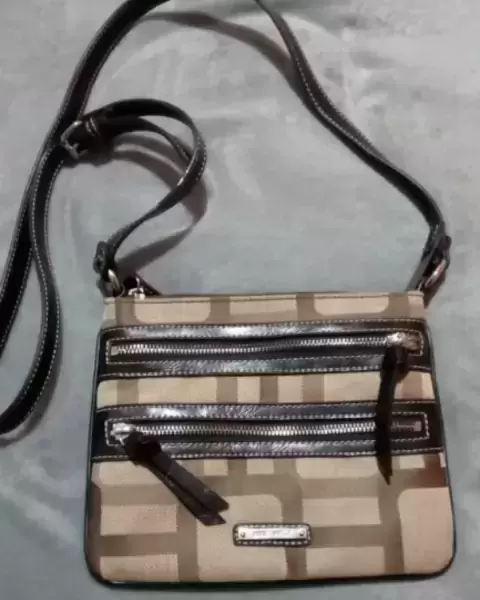 Bolso cross body Nine West en color café/kaki, 3 compartimentos, cierres color plata, 18 cm de largo y 23 cm de ancho..
