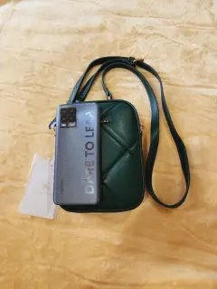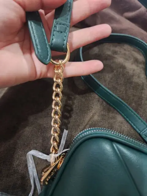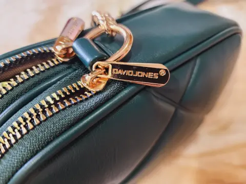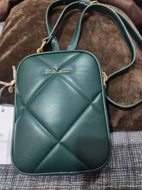 Bolso de buen tamaño con 2 espacios con cierre, correa Mixta de cadena y piel sintética en un hermoso tono green forest de la marca David Jones. Pieza única disponible totalmente nueva , etiqueta y cubre polvo