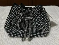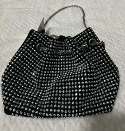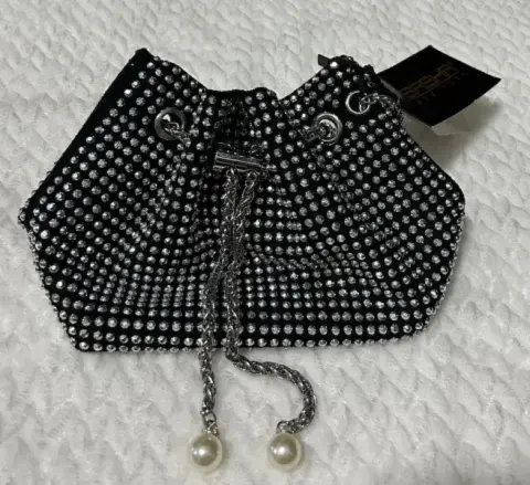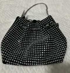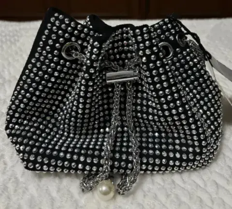 Bolsa negra con estoperoles plateados. Jareta de cierre con Cadena y perlas. Strap largo tipo Cadena para usarse como crossbody. Sin compartimentos interiores. Medida 22 cms de ancho 14 cms de alto