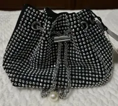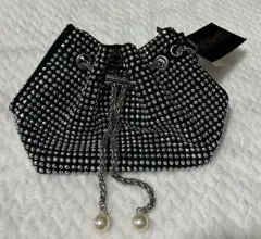 Bolso fiesta Sasha New York. Bolsa negra con estoperoles plateados. Jareta de cierre con Cadena y perlas. Strap largo tipo Cadena para usarse como crossbody. Sin compartimentos interiores. Medida 22 cms de ancho 14 cms de alto