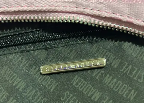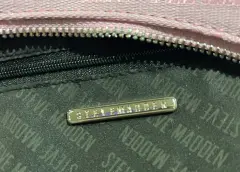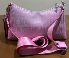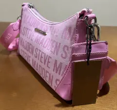 Bolso Steve Madden rosa. Bolso con holograma de la marca impreso en la tela color rosa. Correa ancha y larga para usarse como crossbody. Tres compartimentos interiores. Tarjetero tipo llavero. Medidas 27 cms de frente 13.5 cms de alto 9 cms de profundidad