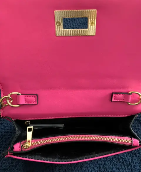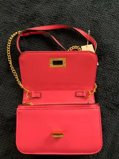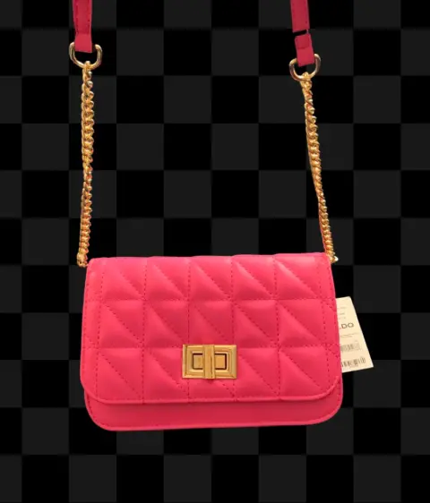 Bolso tipo crossbody marca Aldo. Crossbody color rosa. Strapp cadena dorada y rosa. Tres compartimentos. Amplia y versátil. Contiene monedero billetera y espacio para celular. Medidas 19 cms de ancho 13 cms de alto 4 cms de profundidad