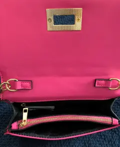 Crossbody color rosa. Strapp cadena dorada y rosa. Tres compartimentos. Amplia y versátil. Contiene monedero billetera y espacio para celular. Medidas 19 cms de ancho 13 cms de alto 4 cms de profundidad