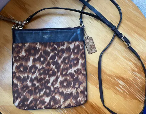 Coach animal print. Bolsa tipo mensajera o crossbody en tela estampada y piel, excelente estética, edición vintage de la marca.