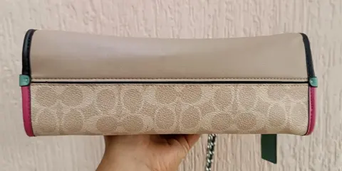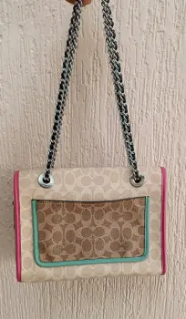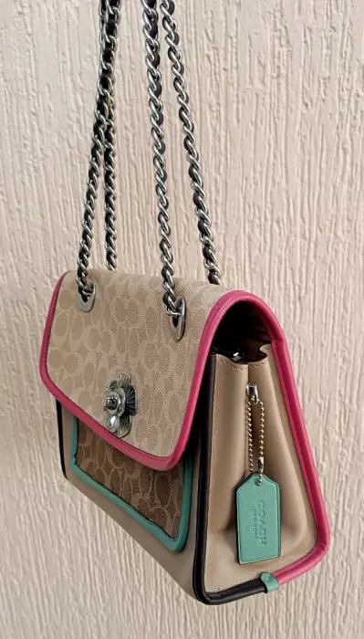 COACH PARKER MONOBLOCK. Hermosa Crossbody COACH MONOGRAM modelo Parker COLORBLOCK súper bella broche de flor y strap de cadena acon piel incluye su Tag, presenta mínimos detalles de uso visibles en fotos herrajes y le falta limpieza