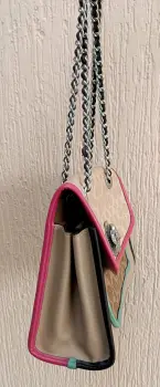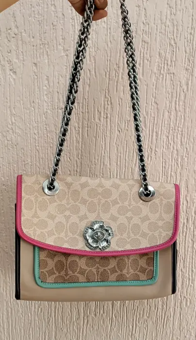 Hermosa Crossbody COACH MONOGRAM modelo Parker COLORBLOCK súper bella broche de flor y strap de cadena acon piel incluye su Tag, presenta mínimos detalles de uso visibles en fotos herrajes y le falta limpieza