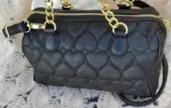 Crissbody Betsey Johnson corazones. Hermosa Crossbody o de mano Betsey Johnson Original en color negro con herrajes dorados, Detalles de uso los raspones en las esquinas que se muestran claramente en las fotos, puedes restaurar pintando.👜😍🎀ÚLTIMO PRECIO. NO MENOS❗Mide 28 cm de Ancho X 24 cm de Alto.OJO!! Grabo antes de enviar por seguridad de mi prenda, corroborando su estado 👁️👁️