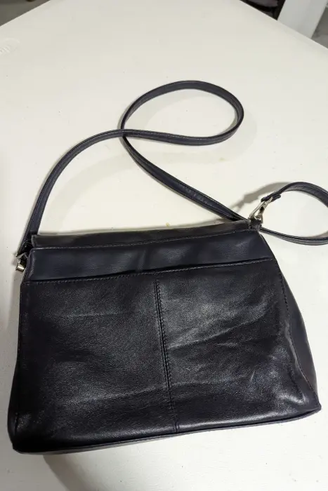 Crossbody azul marino piel. Lindo crossbody azul marino que se ve casi negro, con 5 compartimentos y una bolsita de cierre interna, muy bonita para pasear por la ciudad.Medidas 23 x 20 CM.