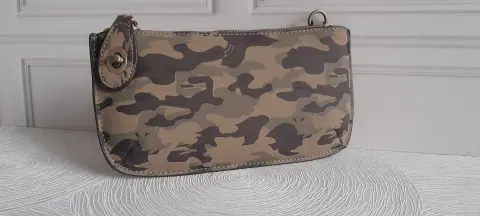 Linda y práctica bolsa color verde militar camuflajeado, trae doble asa para usar como crossbody o muñequera. Por dentro trae una bolsita con sierre, otra sin sierre y tarjetero, material por fuera 100% poliuretano (tipo plástico pero no hule, es un material muy padre) y por dentro tela. Mide 22.5x12 cm