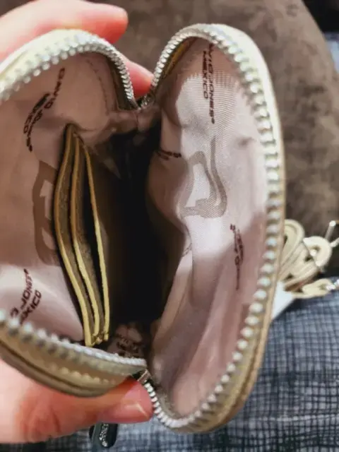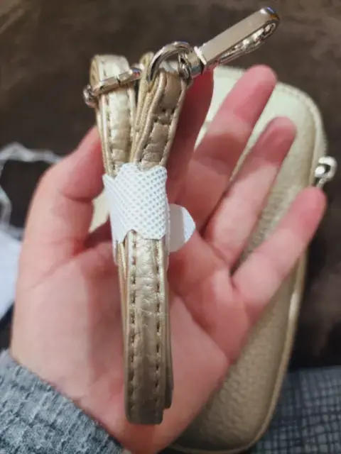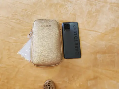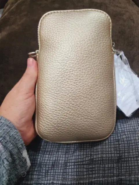 Bolso cruzado con espacio suficiente para celular, además tiene compartimento para tarjetas, correa en piel sintética en un bello y sutil tono dorado. Totalmente nueva con etiqueta y cubre polvo.